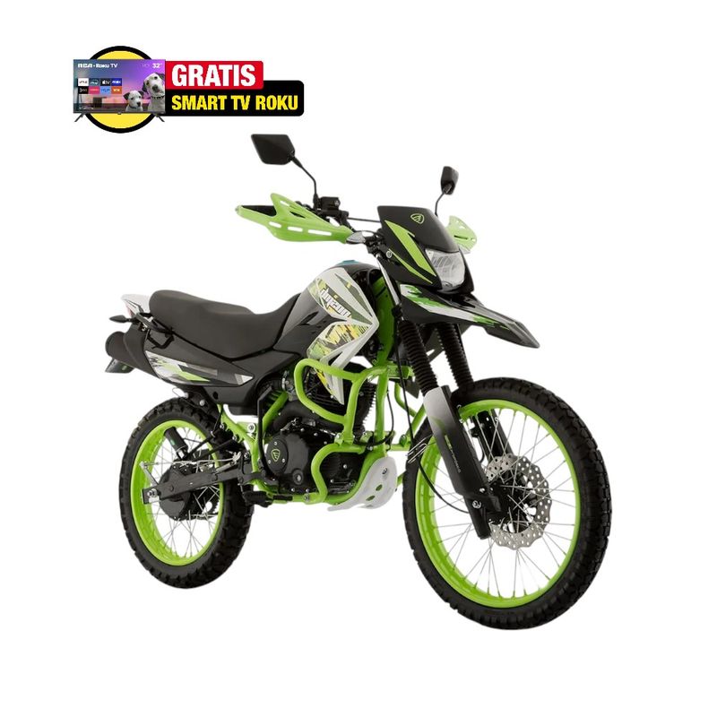 Moto Doble Proposito Italika DM200 Verde/Negro. Arranque eléctrico y de pedal. Doble propósito. Capacidad carga 330 Lbs. Capacidad de combustible 3 Galones. Transmisión estándar. Velocidad máxima 110 km/h Préstamo BAZ: Cuota calculada con el 10% de enganche.