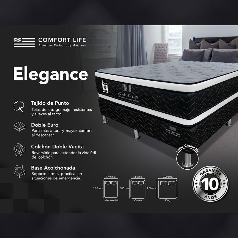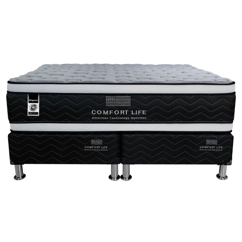 Descanso ideal con cama doble pillow confort semi firme, tela fresca, doble vuelta y foam encased para durabilidad. Base extra, patas cromadas y bordado elegante.